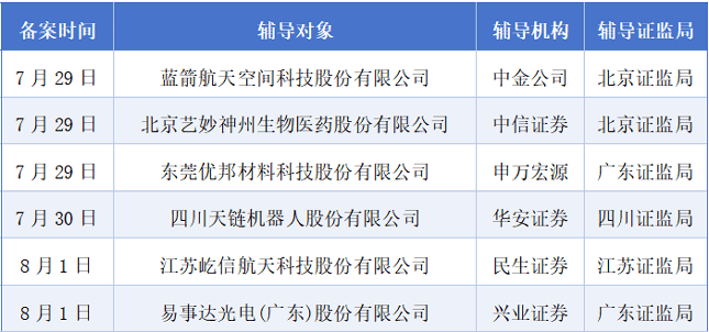 7月28日至8月3日期间新增辅导备案企业6家,分别为蓝箭航天空间科技股份有限公司、北京艺妙神州生物医药股份有限公司、东莞优邦材料科技股份有限公司、四川天链机器人股份有限公司、江苏屹信航天科技股份有限公司、易事达光电(广东)股份有限公司。