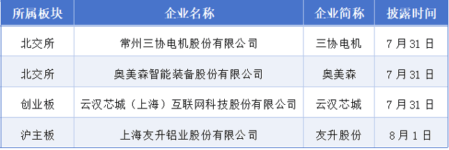 7月28日至8月3日期间,常州三协电机股份有限公司、奥美森智能装备股份有限公司、云汉芯城(上海)互联网科技股份有限公司、上海友升铝业股份有限公司,共4家企业拿到了注册批文。